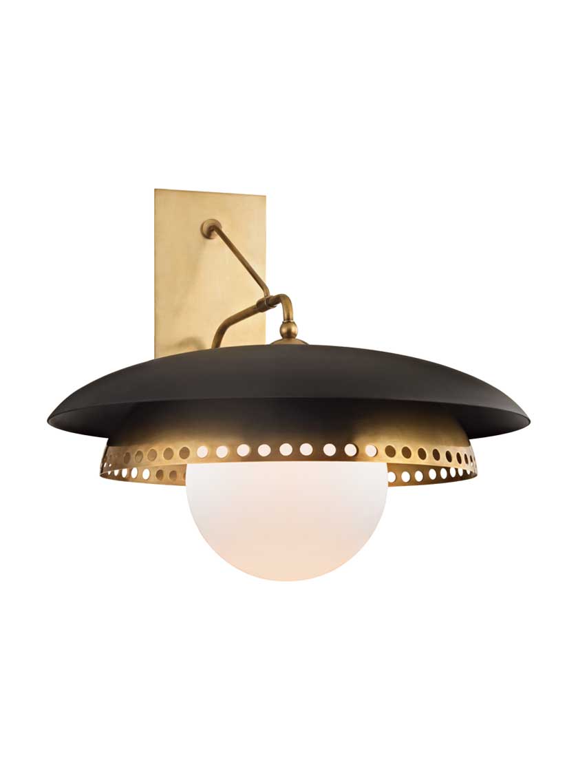 A unique update of Danish Mid-Century modern lighting principles, the Herkimer Collection brings a unique look to any contemporary home. The thick top shade of this wall sconce contrasts in texture and color with its smaller perforated shade, while an etched opal-glass shade hangs low, softly diffusing the light. Available in two classic finishes, it is sure to get noticed!