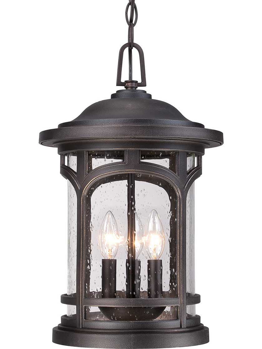 The Marblehead collection brings a rich, masculine style to your outdoor decor. Stately in form, this pendant's arches give the clear, seedy-glass panels a window like appearance. Especially designed for coastal environments, its weather-resistant, metal construction ensures long-lasting wear.