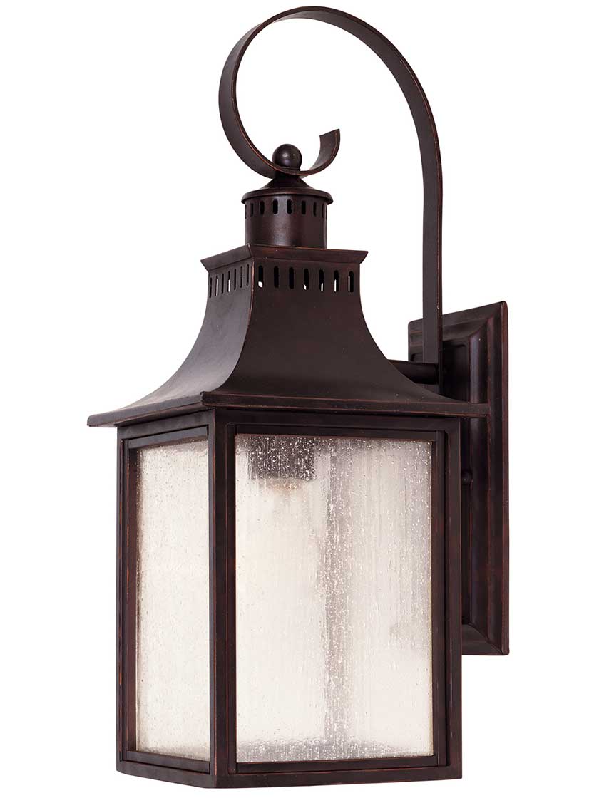 Inspired by traditional style, the Monte Grande 17 3/4-Inch Wall-Mount Lantern brings a sense of Old New England character. This lantern features a pale cream seedy glass, drip candle covers, and a smooth English-bronze finish. A rust-resistant powder coating makes it ideal for your patio or porch.