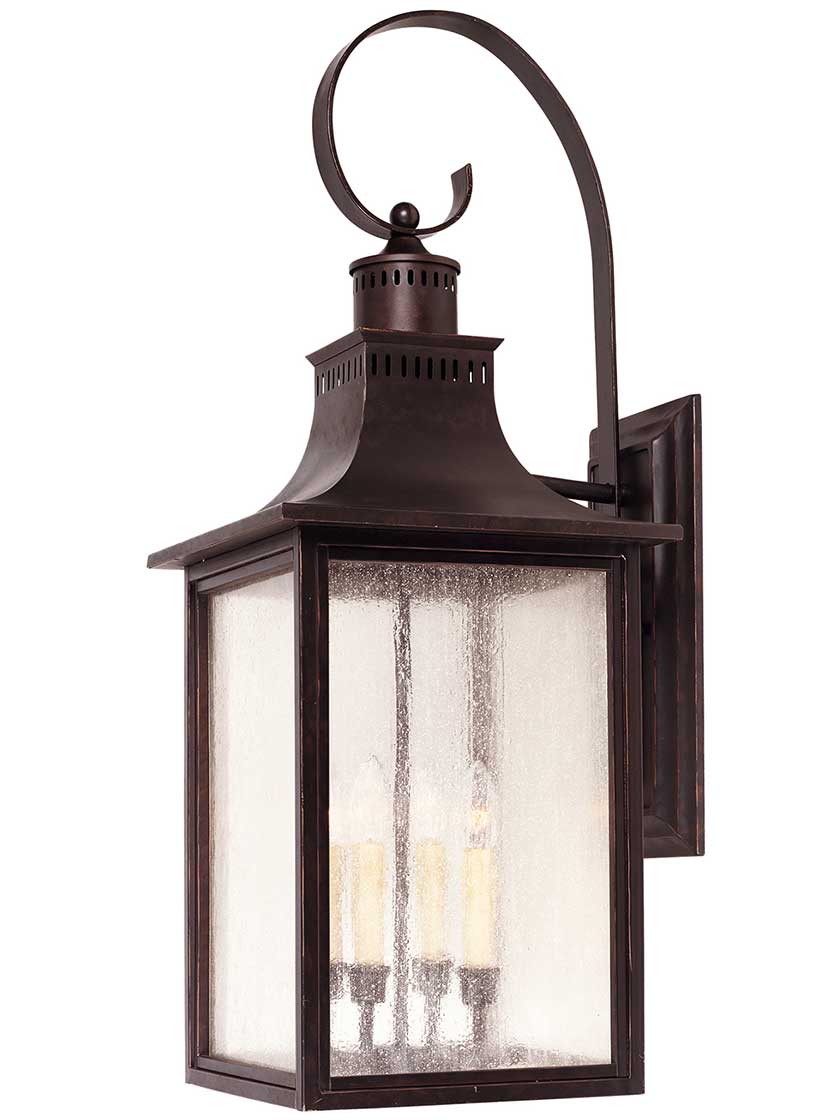 Inspired by traditional style, the Monte Grande 34 1/2-Inch Wall-Mount Lantern brings a sense of Old New England character. This lantern features a pale cream seedy glass, drip candle covers, and a smooth English-bronze finish. A rust-resistant powder coating makes it ideal for your patio or porch.