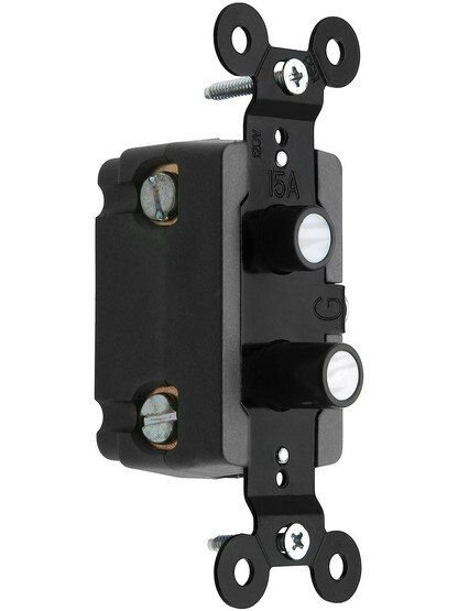 Switch case dimensions: 1 1/4" W x 2 7/16" H x 1 5/16" D. Button diameter: 15/32". Rated for 120V - 15 amps - 60 Hz. This switch is side wired with a grounding screw.