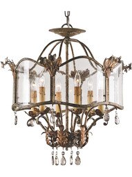 You don't need high ceilings to enjoy the beauty of a crystal chandelier. This elegant Maria Theresa style flush mount is only 20-inch high, yet features hundreds of gorgeous hand cut crystals and a beautifully sculpted canopy. The clear crystal carriage is laced with brass, which is finished in gleaming gold or polished chrome. Lit from within by six candelabra bulbs, it sets your room ablaze with light!