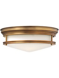 The Hadley 14-inch Flush-Mount Ceiling Light reflects the streamline style of the 1930s. Inspired by Art Deco commercial lights, it features a distinctive shade of etched-opal glass, wrapped in rings of fluted steel. The compact profile is ideal for lower ceilings, and works well in the kitchen, bath, bedroom or hall. Choose from an array of classic finish options.