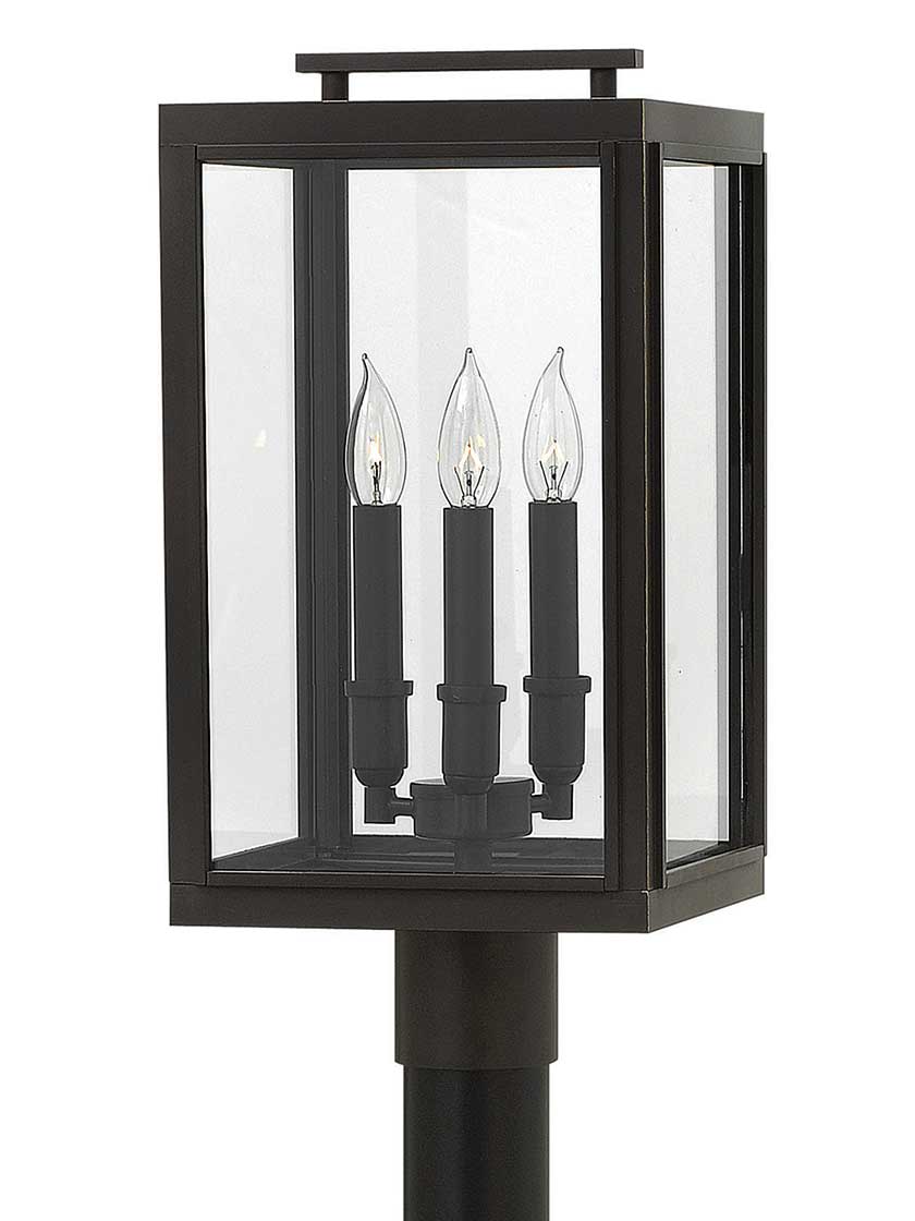 The Sutcliffe post light is a bold representative of old-world style. Its geometric frame features an oiled rubbed bronze finish, panels of clear glass, and a sleek candelabra with copper candle sleeves. Made of weather-resistant aluminum, this fixture is the perfect blend of old and new.